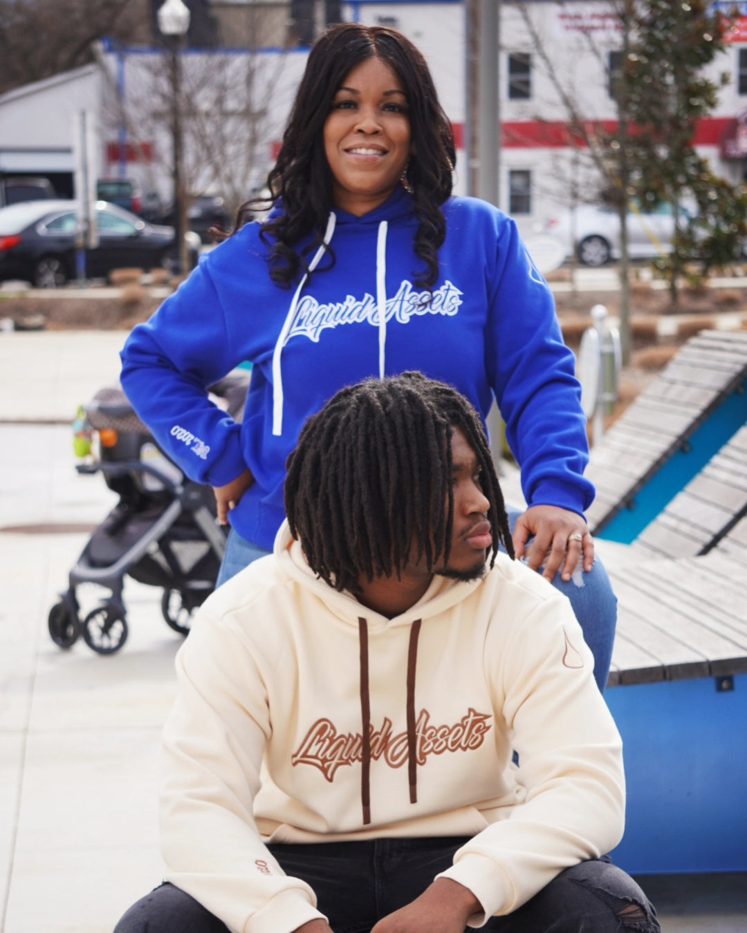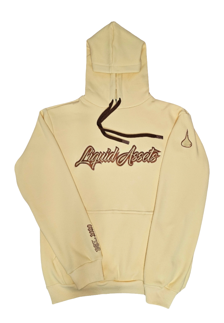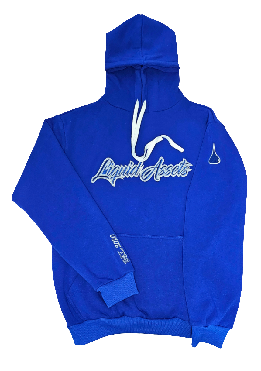 This is a deep royal blue hoodie with the Liquid Assets font on the front outlined with white embroidery, also it has the year of Establishment on the right sleeve with drip logo on the left. very warm and comfortable.