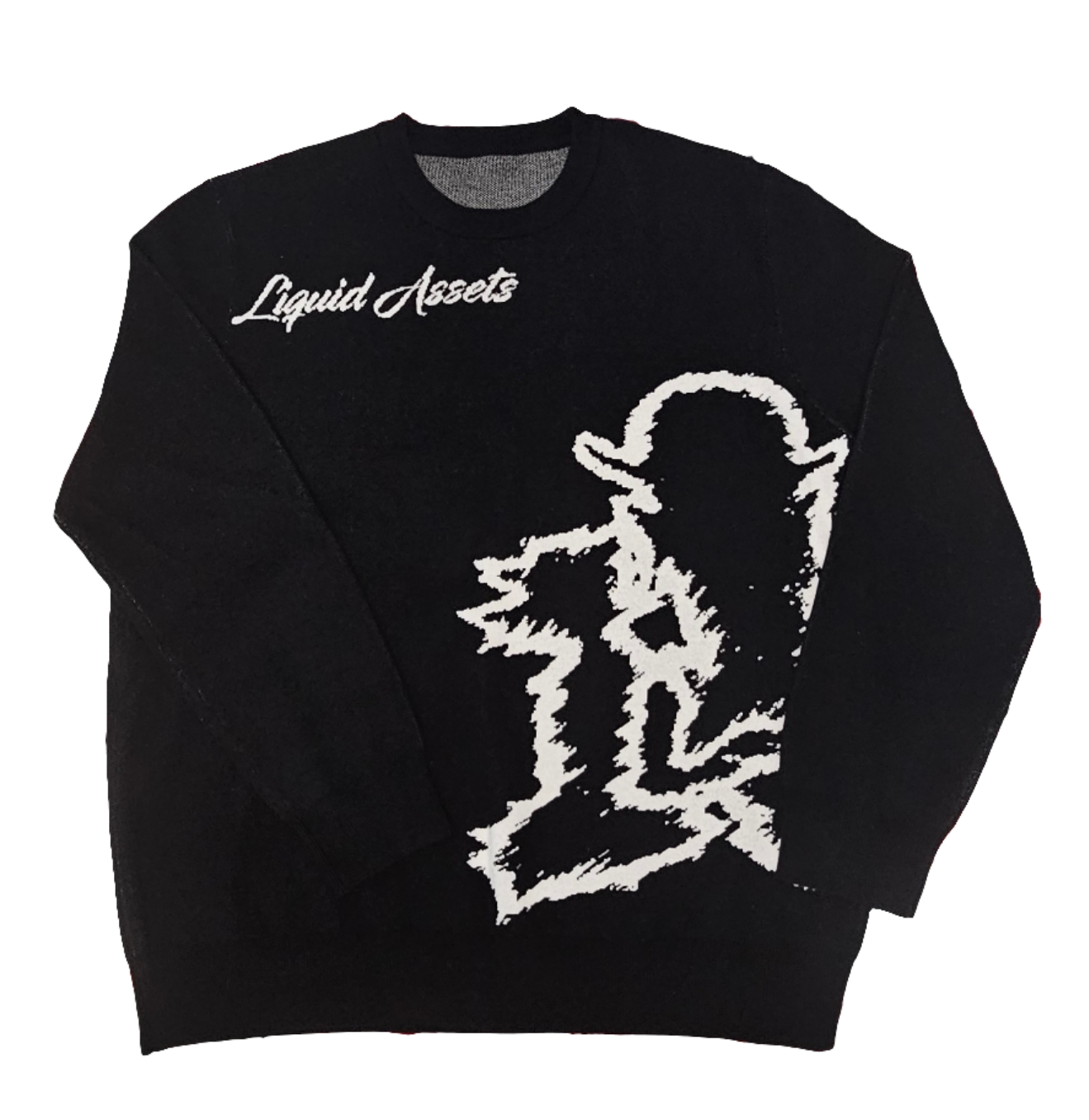 This black sweater has the white scribble Moneyman logo that wraps around the body.. Note * This 100% cotton sweater is only available on pre order and will be shipped 3 weeks after purchase